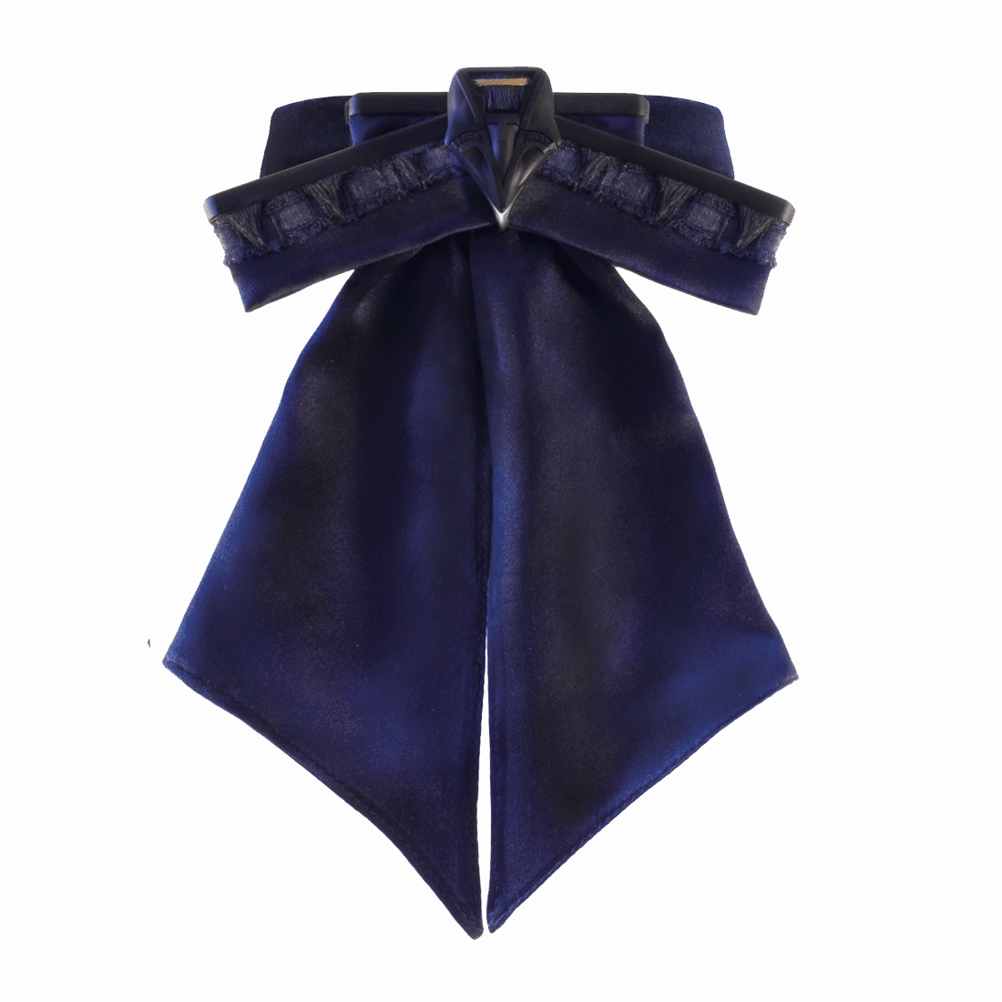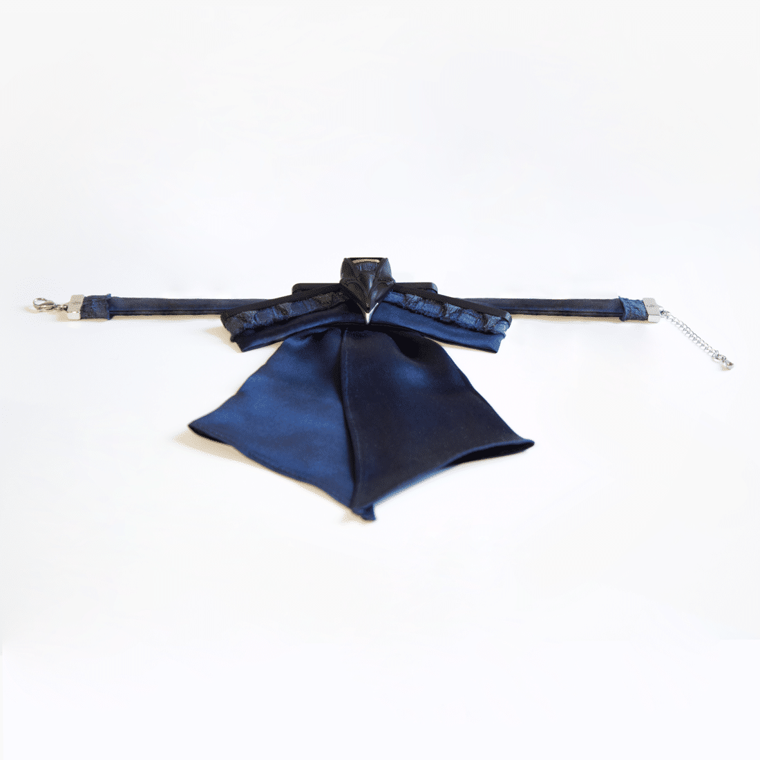 The Harpyia Collar can be worn around the neck as a bow tie or as a choker. The sizes follow the circumference of the neck. A larger size should be selected if worn lower down.
